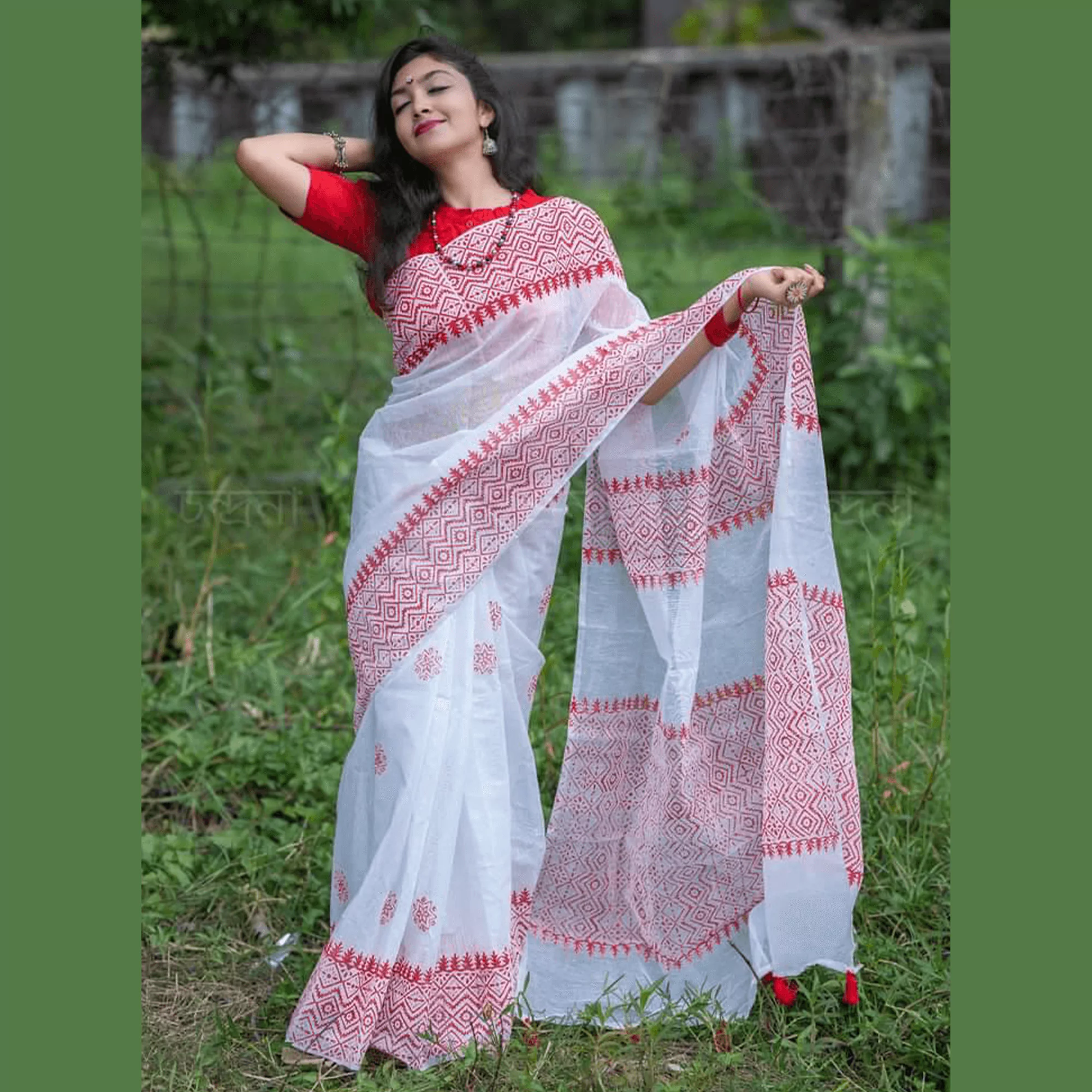 • ম্যাচিং ব্লাউজ ফ্রি: প্রতিটি শাড়ির সাথে ম্যাচিং ব্লাউজ ফ্রি দেওয়া হয়, যা ব্লক প্রিন্ট শাড়ির ক্ষেত্রে বিরল।